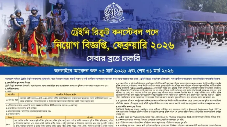 পুলিশ কনস্টেবল নিয়োগ বিজ্ঞপ্তি ২০২৬ প্রকাশিত হয়েছে। ২৬ ফেব্রুয়ারি এই নিয়োগ বিজ্ঞপ্তি প্রকাশ করেছে বাংলাদেশ পুলিশ। পুলিশের অফিসিয়াল ফেসবুক পেজে এক পোস্টে এই তথ্য জানানো হয়েছে। বিজ্ঞপ্তিতে বলা হয়েছে, বাংলাদেশ পুলিশে ট্রেইনি রিক্রুট কনস্টেবল (টিআরসি) পদে নিয়োগের জন্য আগ্রহী যোগ্য পুরুষ ও নারী প্রার্থীদের অনলাইনে আবেদন করার আহ্বান জানানো যাচ্ছে।