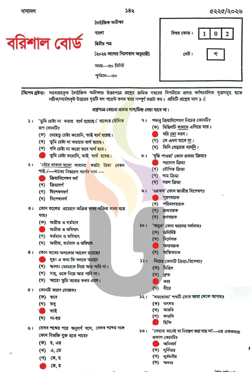 বরিশাল বোর্ড এসএসসি বাংলা ২য় পত্র MCQ প্রশ্ন সমাধান ২০২৬