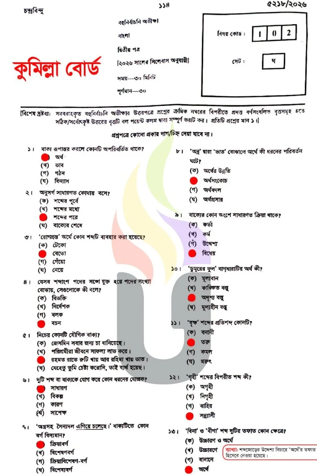 কুমিল্লা বোর্ড এসএসসি বাংলা ২য় পত্র MCQ সমাধান ২০২৬