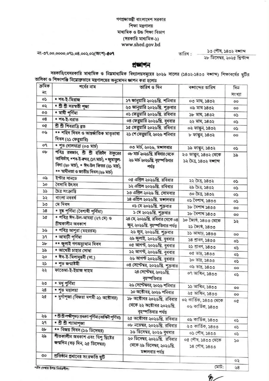 নিম্ন মাধ্যমিক ও মাধ্যমিক বিদ্যালয়ের ২০২৬ সালের ছুটির তালিকা প্রকাশিত হয়েছে। তালিকায় মোট ৬৪ দিন ছুটি রাখা হয়েছে। গত বছর এই ছুটি ছিলো ৭৬ দিন। সে হিসেবে ছুটি কমেছে ১২ দিন। এছাড়াও শুক্র ও শনিবার ছুটি বহাল রাখা হয়েছে।